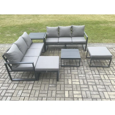 Aluminium 6 Pieces Garden Furniture Sofa Set with Cushions 8 Seater Outdoor Patio Square Coffee Table Side 2 Big Footstools Dark Grey