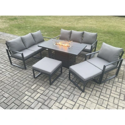 General description This deluxe garden furniture set is constructed from sturdy alloy aluminum, ensuring durability and longevity for outdoor use all year round. It adds a stylish touch to your patio, deck, backyard, porch, or pool area. The set includes a gas fire pit dining table and comfortable seating for up to nine people, making it perfect for gatherings and outdoor dining. Technical specifications Set Dimensions: 2 x 3 Seater Sofa: 166W x 73D x 78H cm 1 x Chair: 74L x 70W x 78H cm 2 x Big Footstools: 60L x 60W x 35H cm 1 x PC Dining Table with Fire Pit: 140L x 80W x 70H cm (Aluminum table top without glass) Color: Dark grey powder-coated aluminum with dark grey fabric Seat Cushion Thickness: 9 cm Usage Recommended to use a 5 kg gas tank for the fire pit. Before using the fire pit, check for any gas leaks at the joints or hose connections. Keep the cushions indoors or covered when not in use to prolong their life. Use a rain cover for the furniture if it will not be used for an