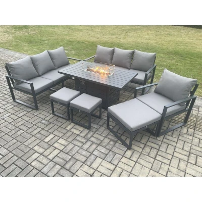 Aluminium 7 Pieces Garden Furniture Sofa Set with Cushions 10 Seater Gas Fire Pit Dining Table 3 Footstools Dark Grey Fimous