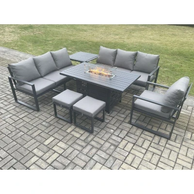 Aluminium 7 Pieces Garden Furniture Sofa Set with Cushions 9 Seater Gas Fire Pit Dining Table Side 2 Small Footstools Dark Grey