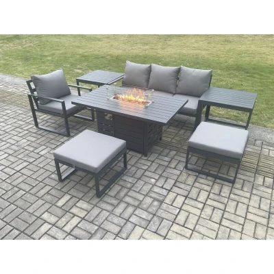 Aluminium 7 Pieces Garden Furniture Sofa Set with Cushions Gas Fire Pit Dining Table 2 Big Footstools Side Tables Dark Grey Fimous