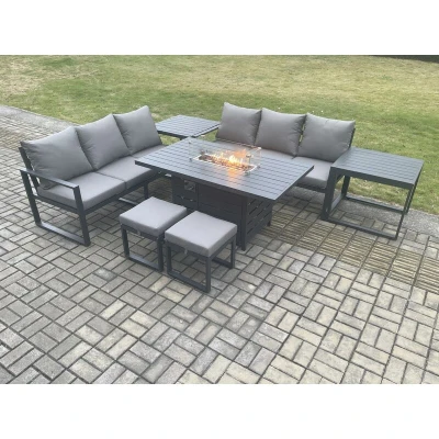 Aluminium 8 Seater Outdoor Garden Furniture Lounge Sofa Set Gas Fire Pit Dining Table with 2 Small Footstools Side Tables Dark Grey Fimous