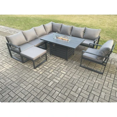 Aluminium 9 Seater Garden Furniture Outdoor Set Patio Lounge Sofa Gas Fire Pit Dining Table with Chair Big Footstools Dark Grey Fimous