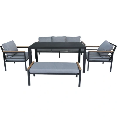 General description Elevate your outdoor living space with this contemporary 5-Piece Aluminium Frame Garden Sofa Set in sleek black. Designed for comfort and durability, the set includes a spacious 3-seater sofa, two single armchairs, a matching bench, and a wide rectangular table, all crafted with a rust-resistant aluminium frame. Perfect for UK patios, gardens, or terraces, this stylish set combines form and function for outdoor relaxation and entertaining.
