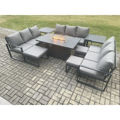 Aluminium Garden Furniture Outdoor Set Patio Lounge Sofa Gas Fire Pit Dining Table Sets with 3 Footstools 2 Side Tables Dark Grey Fimous