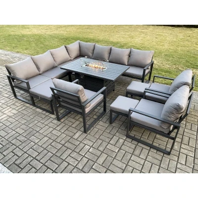 Aluminium Lounge Corner Sofa Outdoor Garden Furniture Sets Gas Fire Pit Dining Table Set with 3 Chairs Footstools Dark Grey Fimous