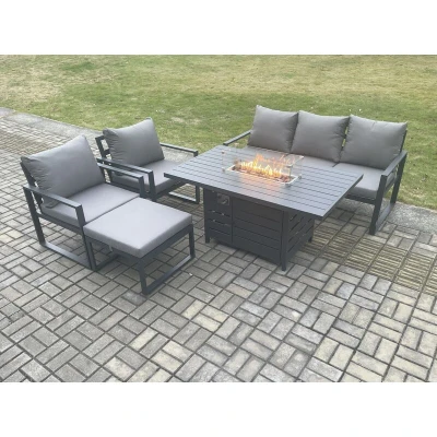 Aluminium Outdoor Garden Furniture Set Gas Fire Pit Dining Table Heater Burner with 2 Arm Chair Big Footstool Dark Grey 6 Seater Fimous