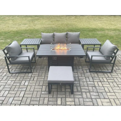 General description This aluminium outdoor garden furniture gas fire pit dining table set comfortably accommodates 6 people, making it an ideal addition to your patio, garden, backyard, or pool area. It features a dining table designed to hold food and drinks, along with two armchairs, two side tables, and a big footstool, all in a stylish dark grey finish. Technical specifications 1 x 3 Seater Sofa: 166W x 73D x 78H cm 2 x Chair Size: 74L x 70W x 78H cm 2 x Side Coffee Table: 68L x 68W x 59H cm 1 x Big Footstool: 60L x 60W x 35H cm 1 x PC Dining Table with Fire Pit: 140L x 80W x 70H cm (Aluminum table top without glass) Material: Alloy aluminum frame with powder coating to prevent rust Cushion thickness: 9 cm with soft pillow back cushion Usage To ensure safe operation, please follow these guidelines: Do not cover the igniter with lava. Use a 5 kg gas tank for optimal performance. Before using the fire pit, check for any gas leaks at the joints or hose connections. If the gas bottle