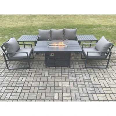 Aluminium Outdoor Garden Furniture Set Gas Fire Pit Dining Table Heater Burner with 2 Arm Chair Side Tables Dark Grey 5 Seater Fimous