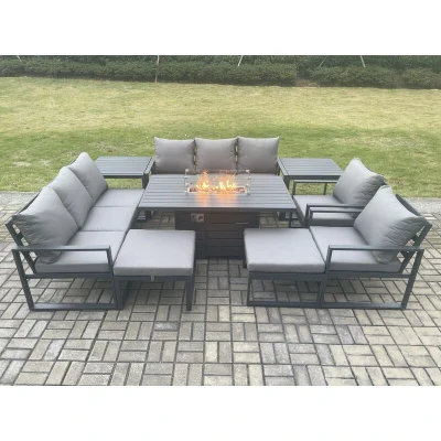 Aluminium Outdoor Garden Furniture Set Patio Lounge Sofa Gas Fire Pit Dining Table with 2 Side Tables Big Footstools Dark Grey Fimous