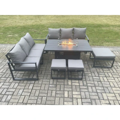 Aluminium Outdoor Lounge Sofa Garden Furniture Sets Gas Fire Pit Dining Table Set with 3 Footstools Dark Grey Fimous
