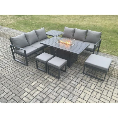 Aluminium Outdoor Lounge Sofa Garden Furniture Sets Gas Fire Pit Dining Table Set with 3 Footstools Side Dark Grey Fimous