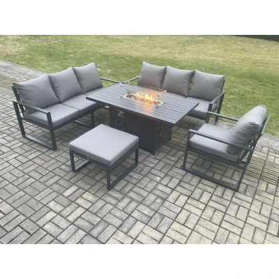 Aluminium Outdoor Lounge Sofa Garden Furniture Sets Gas Fire Pit Dining Table Set with Arm Chair Big Footstool Dark Grey Fimous