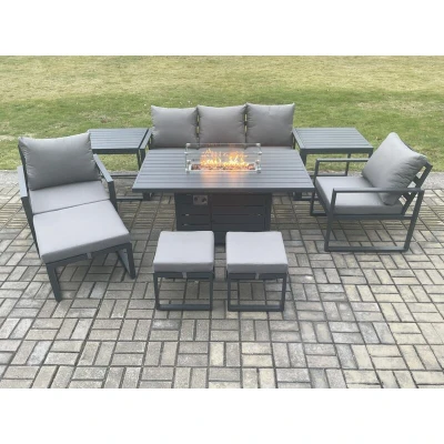 Aluminium Patio Outdoor Garden Furniture Lounge Sofa Set Gas Fire Pit Dining Table with 2 Side Tables 3 Footstools Dark Grey Fimous