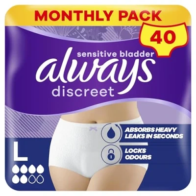 Always Discreet Incontinence Pants Women Large, UK Size 16 22, White, Absorbency 5, 40 Disposable Underwear , Knickers (10 x 4 Packs), Heavy Bladder Leak Protection Maternity Postpartum