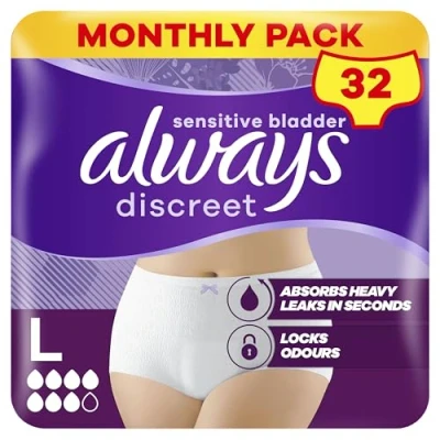 Always Discreet Incontinence Pants Women Large, UK Size 16 22, White, Absorbency 7, 32 Underwear , Disposable Maternity Knickers (8 x 4 Packs), Heavy Bladder Leak Protection Postpartum