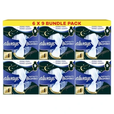 Always FlexProtect Sanitary Towels Size 4 Night Extra Wings, Up to Zero Feel Leaks, Flexible Protection, Softest Toplayer, Unscented, 9 Pads x 6 Pack