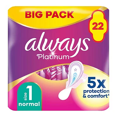 Always Platinum Normal Sanitary Towels with Wings (Size 1, 22 Pads) provide up to 100% leak protection and extra comfort with ComfortLock wings, 3D LeakGuard, and OdourLock technology, making them ideal for medium flow and day use.