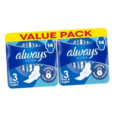Always Ultra Day & Night Sanitary Towels with Wings Size 3 28 Pads (Pack of 2x14), Locks Leaks Odours, Dermatologically Tested, SecureFit, Comfortable Wear