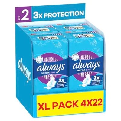 Always Ultra Day Sanitary Towels Long (Size 2) with Wings 88 Pads, Super Absorbent and Thin, for Menstrual Periods