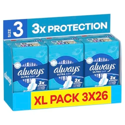 Always Ultra Sanitary Towels Long Plus (Size 3) with Wings 78 Pads, Super Absorbent and Thin, for Menstrual Periods