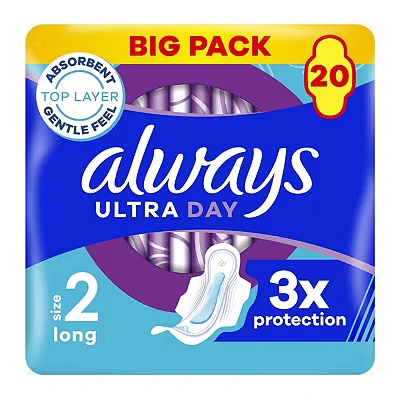 Always Ultra Day Sanitary Towels Long (Size 2) with Wings offer 3x protection—InstantDry, LeakGuard, and OdourLock—for all-day comfort and confidence. Dermatologically approved and designed for a secure fit, these 20 pads ensure reliable, gentle protection.