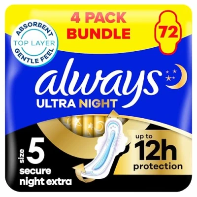 Always Ultra Sanitary Towels/Pads with Wings, Secure Night Extra Size 5, Thin, 72 Towels (18 x 4 Packs), Super Saving Box, Odour Neutraliser, Absorbent Core