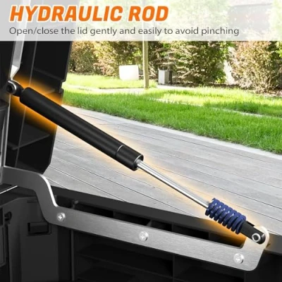 260-gallon outdoor storage box, you'll have a huge amount of storage space to hold more items. Whether it's family party supplies, camping gear, gardening tools, or children's toys, this extra large capacity storage box will meet your storage needs. Our deck box has extra reinforced steel beams on the inside to make it stronger and more durable. This special design ensures that the box stays solid in the face of challenges and stresses, so you can store heavy items without worrying about deformation, bending or damage. The innovative air lever design makes opening and closing the deck box easy and smooth. Simply push the lid and the bar will automatically support the lid for quick removal or insertion of items, and when closed, the good damping will slowly descend so you don't have to worry about pinching your hand. Patio storage box is made of resin material to protect your items from harsh weather and UV rays. Not only that, it's waterproof, dustproof and fade resistant, with lockable features that keep your belongings dry, clean and in like-new condition at all times. This deck box is not only a storage solution, but also a versatile piece of outdoor furniture. With its 1800bls weight capacity, you can use it as extra seating for outdoor gatherings and comfort, or as a patio table for your drinks and snacks. Its multi-functional design gives you more flexibility and variety in your outdoor space.