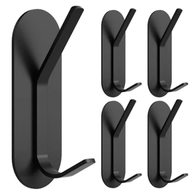 Alyvisun 5Pcs Self Adhesive Hooks, Stainless Steel Stick On Wall Hanging Hooks Heavy Duty, Strong Sticky for Bathroom, Kitchen, Cupboard, Back of Door (Black)
