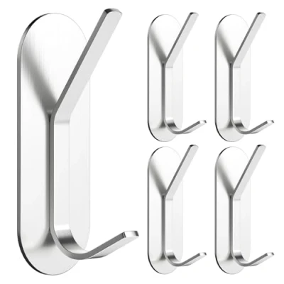 Alyvisun 5Pcs Self Adhesive Hooks, Stainless Steel Stick On Wall Hanging Hooks Heavy Duty, Strong Sticky for Bathroom, Kitchen, Cupboard, Back of Door (Silver)