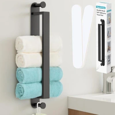 🛀Optimised Space & Hooks🛀: Our towel rail is designed with a 65mm spacing and a widened 45mm base plate to increase the contact area with the wall, addressing the issue of limited space for hanging towels. The two hooks are also perfect for hanging smaller items like shower balls, brushes, and more. 🛀 Durable & Rust‑Resistant 🛀: Made from stainless steel and finished with a protective wax coating, this wall mounted towel rail resists rust, moisture and corrosion. It offers a long service life and is ideal for wet areas such as bathrooms and kitchens. 🛀Strong Adhesion & Reattach🛀: The self adhesive towel holder without drilling uses an improved double-sided adhesive with stronger bonding, making the installation more secure.We also provide spare adhesive backing, so if you're not satisfied with the initial application, you can use it to easily reattach the product. 🛀 Dual-Mount Versatility🛀: Revolutionise your space with our dual-orientation towel holders for bathrooms. Featuring innovative two-way installation, mount it vertically for narrow gaps or horizontally under cabinets. This smart design maximises unused corners while maintaining full functionality. Perfect for renters and homeowners seeking intelligent storage solutions. 🛀Easy Installation & Adjustable🛀: The installation process requires just three simple steps – clean the wall, peel off the backing, and press to adhere. Suitable for smooth surfaces such as tiles, metal, wood, and glass. After installation, please allow 24 hours before using the towel holder in the bathroom to ensure optimal bonding performance.