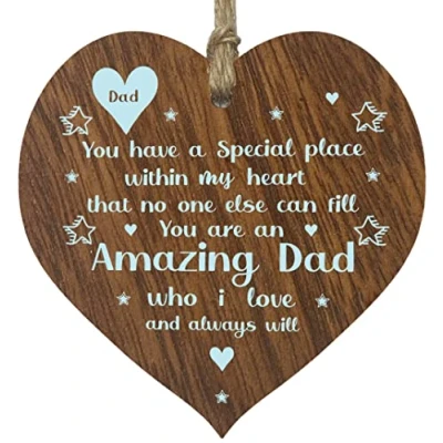 A LITTLE SOMETHING TO MAKE DAD SMILE: These exceptional quality heart shaped wooden plaque make some of the best Dad gifts on the market. A great Fathers day gifts shows the design "Dad you have a special place within my heart that no one else can fill. You are an Amazing Dad who i love and always will" If you are looking for worlds best dad gifts then then this hanging wooden decoration is bound to make them smile. EVERY HEART IS TRUELY UNIQUE: Unlike other brands our beautiful plaques are made from raw wood and not a laminated MDF. This means that every single heart will have it's own pattern and indentation from the grain of the wood used. Each heart is hand finished with a lacquer varnish that really accentuates the deep colour of the wood and also makes the ink of the pattern/text clearer and brighter in colour. WHAT DO YOU GET: This daddy gifts is made from the highest quality wooden signs and plaques. Tell dad how wonderful they are on their Birthday, Valentines, Christmas, or any time say something out of love. It can be used to hang round prosecco, champagne, wine & spirits gifts. Versatile and well-made personalised gifts for men from Stuff4 Ltd. MADE AND QUALITY CHECKED IN THE UK: We manufacture all our products right her in the UK so you can be sure of a fast turnaround and a product that is expertly made - some things i still can't tell you poems. We have the perfect dad gifts available on Amazon. This beautiful heart can be used to say happy fathers day daddy. EASY TO HANG: The hanging wooden heart plaque comes equipped with a small jute twine, which can be then used to hang it on somewhere for decoration. The wooden sign is convenient for you to assemble without spending your too much effort and time.