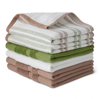 PREMIUM 100% ORGANIC COTTON: Ultra-absorbent waffle weave texture delivers superior moisture absorption and quick-drying performance for all your kitchen needs VERSATILE 6-PIECE SET: Perfect size 38 x 64 cm dish cloths include 2 pcs Olive Light/Brown Strip, 2 pcs Brown, 1 pc Olive Light, 1pc White - coordinated colors to match any kitchen décor SUPERIOR PERFORMANCE: Lint-free waffle texture is ideal for streak-free drying of dishes, glasses, silverware and delicate cookware. Gets softer with each wash while maintaining durability CERTIFIED QUALITY & SAFETY: GOTS (Global Organic Textile Standard) certified organic cotton. Made in OEKO-TEX Standard 100 certified factory ensuring highest safety and environmental standards EASY CARE & MAINTENANCE: Machine washable and dryer safe. Maintains softness and absorbency wash after wash. No harsh chemicals or dyes used Certified STANDARD 100 by OEKO-TEX, which requires textiles-based products to be tested against a list of 1,000+ chemicals, to limit those which may be harmful to human health Made with 100% Global Organic Textile Standard (GOTS) certified organic cotton