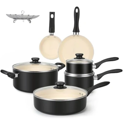 Amazon Basics Ceramic Non Stick Pots and Pans, 11 Piece Cookware Set, PFOA PTFE Free, Black/Cream