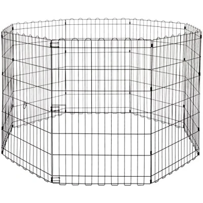 Indoor/outdoor portable pet playpen (without door) creates up to 1.85 m² enclosure for playtime and exercise Includes 8 connected panels, thumb clips for connecting the ends together, and 8 ground anchors for outdoor use Durable wire construction made of iron with a rustproof black finish Sets up in seconds; simply unfold, shape, and connect (no tools required). Folds flat for easy transport and compact storage Product dimensions: 8 connected panels, each measuring 24 x 36 inches (61 x 91 cm) (LxH, per panel). Dimension when assembled: 60 x 60 x 36 inches (150 x 150 x 91 cm) (LxWxH, round) or 48 x 48 x 36 inches (122 x 122 x 91 cm) (LxWxH, square) Recommended for small and medium sized breeds