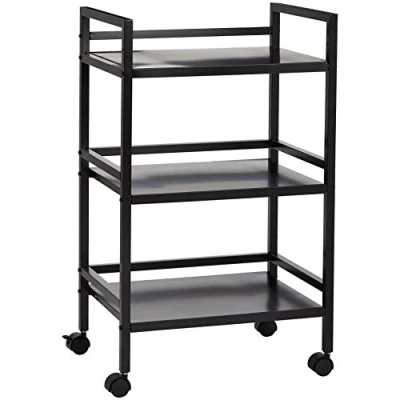 Three-tiered metal storage cart on wheels Flat metal shelves with open sides for quick, easy access to essentials Ideal for bathroom, kitchen, and workshop storage Four pivoting caster wheels for smooth, dynamic mobility; easy to move between rooms and workspaces Durable metal construction with black powder-coated finish