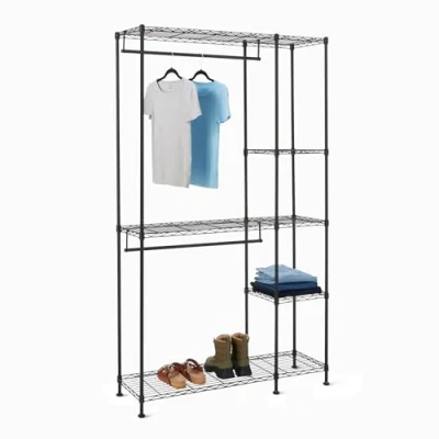 Wardrobe storage rack with clothes-hanging space and multiple shelves for easy organizing Made of durable metal with a Black powder coated finish for rust resistance Large shelf holds 100 pounds, small shelf holds 50 pounds, hanging rod holds 60 pounds Easy assembly Product Dimensions: 45 x 14 x 76 inches (LxWxH)