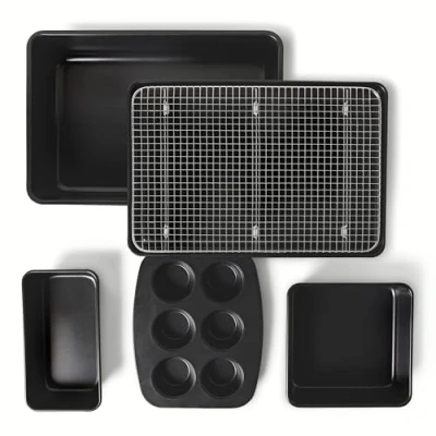 6-PIECE SET: 6-piece set with cookie sheet, muffin pan, square baking pan, loaf pan, roaster pan, and cooling rack HEAT CONDUCTING: Excellent heat conduction, even baking, and effortless food release NONSTICK: Nonstick coating ensures quick and effortless food release and easy cleaning OVEN-SAFE: Oven-safe up to 220°C; versatile for various baking needs STACKABLE: All pieces stack together into one pan for space-saving storage DISHWASHER-SAFE: Dishwasher-safe for quick and convenient cleaning after use. Hand-wash with warm water and mild soap for best results
