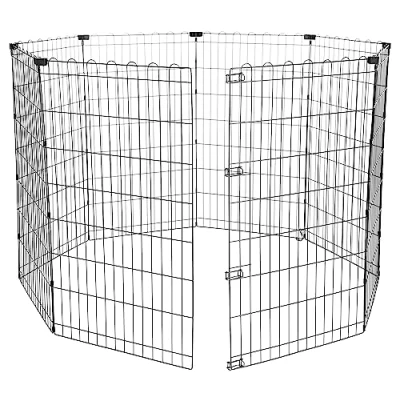 Indoor/outdoor portable pet playpen (without door) creates a 1.85 m² enclosure for playtime and exercise Includes 8 connected panels, thumb clips for connecting the ends together, and 8 ground anchors for outdoor use Durable wire construction made of iron with a rustproof black finish Sets up in seconds; simply unfold, shape, and connect (no tools required). Folds flat for easy transport and compact storage Product dimensions: 8 connected panels, each measuring 24 x 42 inches (61 x 107 cm) (LxH, per panel). Dimension when assembled: 60 x 60 x 42 inches (150 x 150 x 107 cm) (LxWxH, round) or 48 x 48 x 42 inches ( 122 x 122 x 107 cm) (LxWxH, square) Recommended for medium and large sized breeds