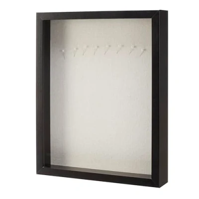 Shadow box frame for displaying 28 cm x 35.5 cm photos, cards, art, and memorabilia Made of MDF wood with tempered shatter-proof glass front for easy viewing 3.8 cm (1.5 inch) deep interior; soft linen back and 8 push pins for securing items Deep footprint provides stable placement on any tabletop. Can be used wall or table mounted horizontally or vertically; Hooks to wall mount in either orientation fitted at the back Product Dimensions (Including Moulding): 38.2 x 30.5 Cms FSC-certified Wood (FSC N004130). Made with materials from well-managed forests, recycled materials, and/or other controlled wood sources