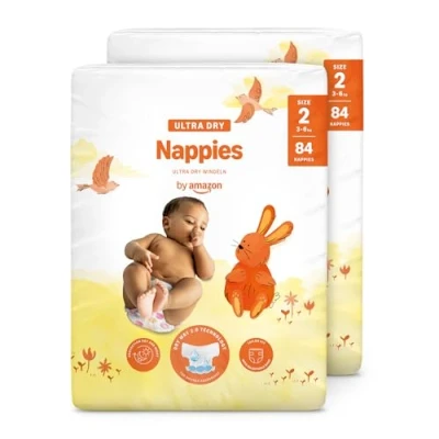 Packaging may vary from images shown.This product was previously a Mama Bear product. Now it’s a part of the by Amazon brand. The product is the exact same formulations, size, quality and the supplier is the same. MULTI-PACK CONVENIENCE: 2 packs; 84 nappies per pack; size 2 PREVENTS LEAKAGE: Tailor fit with double elastic barriers on leg cuffs to prevent leakage OVERNIGHT PROTECTION: Soft and absorbent inner layer; up to 12 hours of overnight protection COMFORTABLE FIT: Super Slim extra embossed top layer to increase comfort DRY-WAY 2.0 TECHNOLOGY: Absorbing air channels help your baby feel dry and comfortable WETNESS INDICATOR: The smart yellow strip turns blue when it's time for a change An Amazon Brand