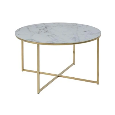 Dimensions: 80 x 80 x 45 cm (L x W x H) Material: Glass top, marble print, metal frame Modern, durable design with crossed metal base and supportive frame; high-quality and easy-to-maintain tempered glass table top with authentic-looking green marble print Generously sized round top for trays, magazines and saucers; gold-finished base with foot caps to prevent floor scratches Assembly instructions included; 2-year warranty