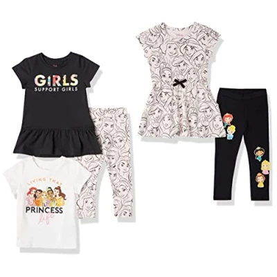 This product was previously sold as Spotted Zebra and now as Amazon Essentials. FABRIC: Tops are cut from our soft and naturally breathable lightweight cotton jersey. Leggings are cut from compact cotton-stretch jersey suitable for a snugger fit. OUTFIT ESSENTIALS: A mini capsule wardrobe for your child, these sets feature core silhouettes in coordinating prints and colors with mix and match styling details. DETAILS: Packs feature short-sleeve top, dress, and tunic with coordinating full-length leggings. The dress has an elasticated waist with decorative bow detail and pockets, the tunic features a ruffle flounce at hem. OFFICIAL LICENSED PRODUCT: Amazon Essentials offers one-of-a-kind products featuring your favorite characters to add wonder to your wardrobe! All products are officially licensed and designed in-house.