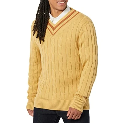 Amazon Essentials Men's Cable Knit V Neck Jumper, Tan, L
