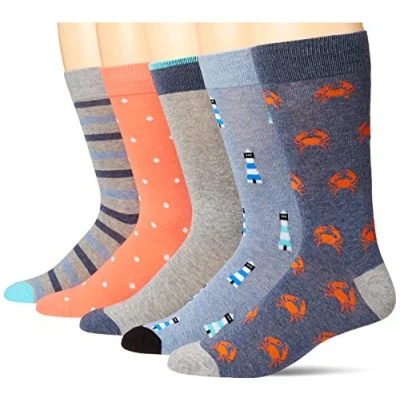 Amazon Essentials Men's Comfortable Patterned Dress Socks, 5 Pairs, Blue/Grey/Navy Crab/Orange Dots/Stripes, 7 11