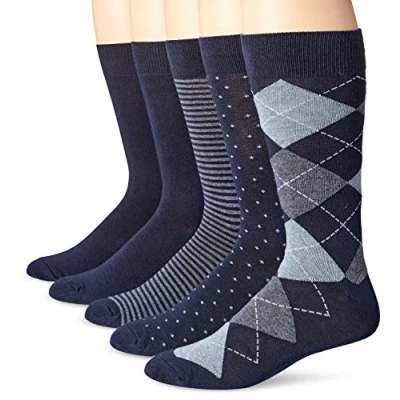 COMFORT AND FIT: These patterned crew-height dress socks fit near the base of the calf, have ribbed cuffs, and a reinforced toe and heel for longer life. MATERIAL: Amazon Essentials socks are made from high-quality and durable materials. These socks are a cotton nylon blend with elastane for superior fit and shape retention. STYLE: Available in multiple patterns and colors. DETAILS: Sold 5 pairs per pack. DESIGN: These socks are perfect for work or everyday wear.