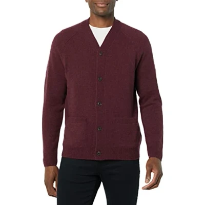 Amazon Essentials Men's Lambs Wool V Neck Cardigan Sweater with Pockets (Previously Goodthreads), Dark Burgundy, Small