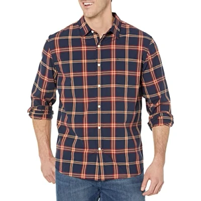 Amazon Essentials Men's Long Sleeved Regular Fit Stretch Poplin Shirt, Navy Red Plaid, XXL