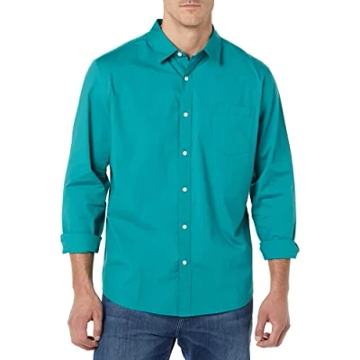 Amazon Essentials Men's Long Sleeved Regular Fit Stretch Poplin Shirt, Teal Blue, S