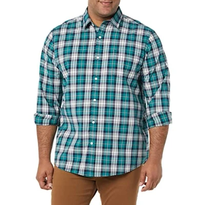 Amazon Essentials Men's Long Sleeved Regular Fit Stretch Poplin Shirt, Teal Blue White Plaid, S